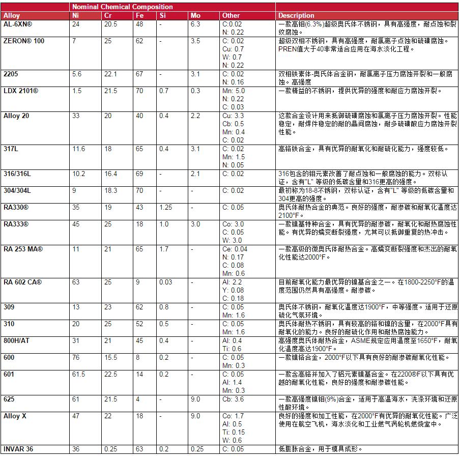 環(huán)境控制 | 我們提供的許多合金可以運用于污染控制系統(tǒng),諸如煙氣脫硫單元FGD,濕法靜電除塵WESP和碳吸收器。在高氯標(biāo)準(zhǔn),酸性PH值和上升溫度組成的腐蝕環(huán)境中,擁有鉬元素的合金可以有效抵御點蝕和裂紋腐蝕。. AL-6XN, ZERON 100和2205在許多FGD和WESP領(lǐng)域中,用來制造吸收容器, 墻壁,輸氣管道,導(dǎo)向裝置,泵,紙漿處理系統(tǒng),葉輪和節(jié)氣閥。AL-6XN在很多FGD系統(tǒng)領(lǐng)域服務(wù)了20多年沒有任何質(zhì)量問題。雙相鋼2205和ZERON 100的高強度和相對高鎳合金更經(jīng)濟的成本,使得它們的運用變得越來越廣。2205雙相鋼也可以用作飛機制造廠的碳吸收和封存容器 |